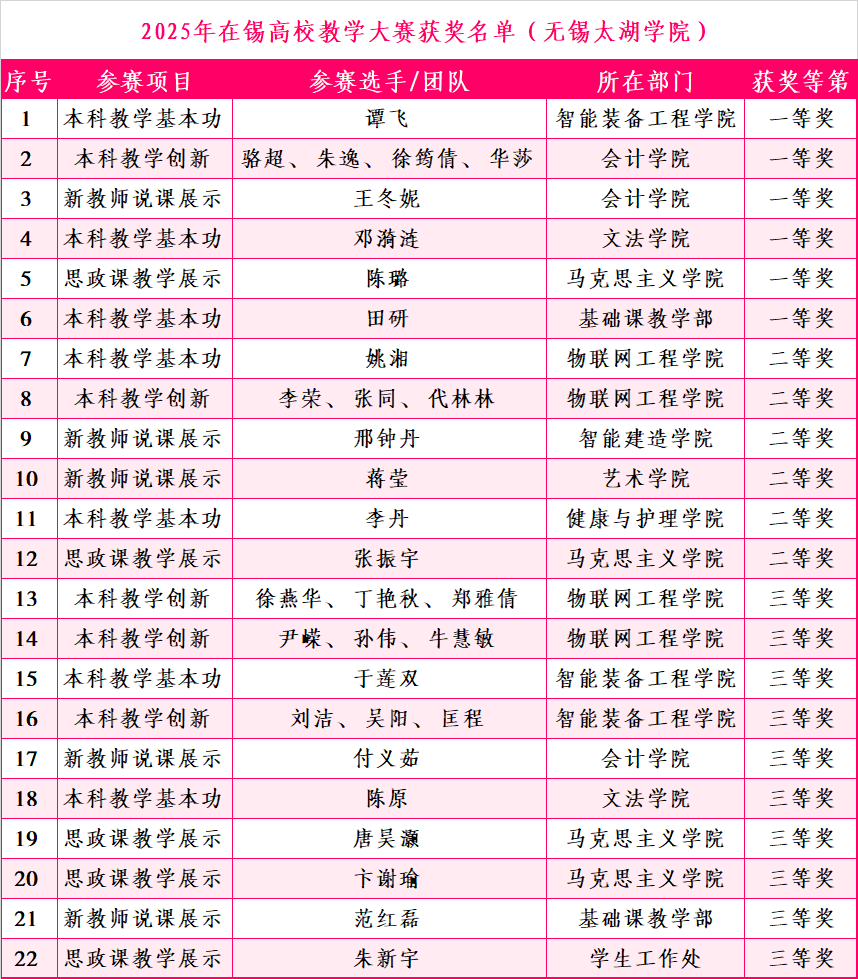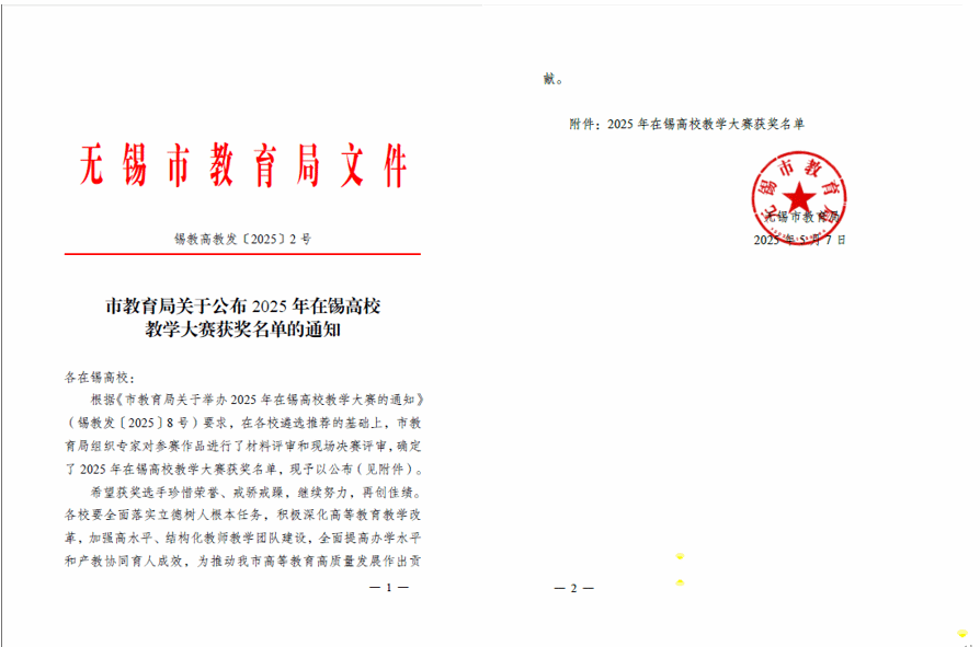 近日,由无锡市教育局主办的第三届在锡高校教学大赛圆满落幕。我校斩获22项大奖,其中一等奖6项、二等奖6项、三等奖10项,获奖总数及一等奖数均位列在锡本科高校榜首,创历史最佳参赛成绩。
