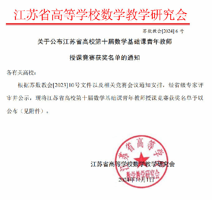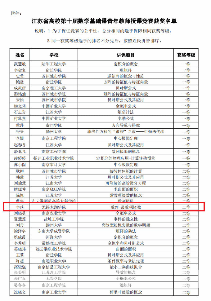 近日,江苏省高校第十届数学基础课青年教师授课竞赛在苏州城市学院圆满落幕。此次竞赛由江苏省教育厅指导、江苏省高等学校数学教学研究会主办。经过激烈的角逐,我校基础课教学部李琰老师的《数列-常数项级数》在众多参赛作品中脱颖而出,荣获二等奖。
