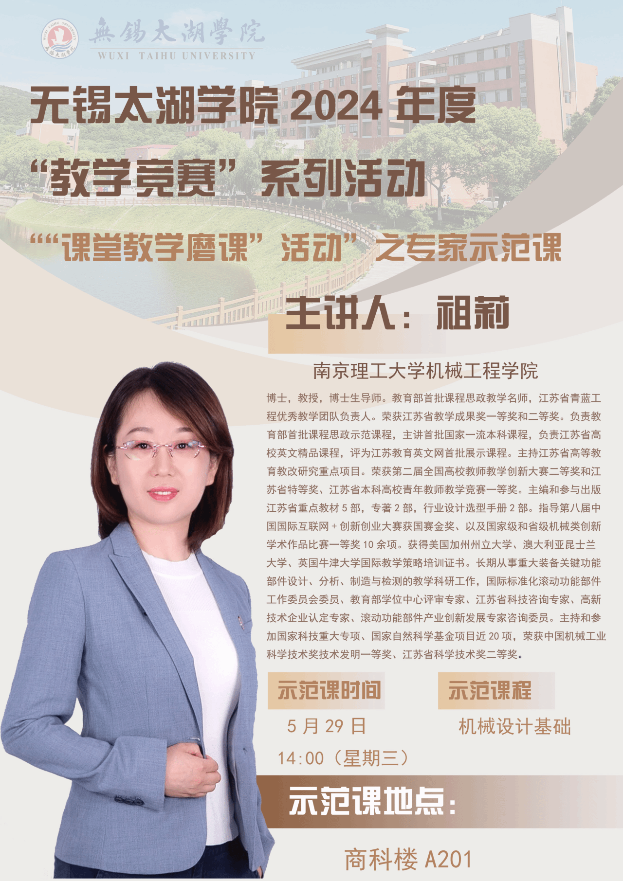为响应学校《关于开展“课堂教学磨课”活动的通知》文件的要求,智能装备工程学院拟定了关于课堂教学磨课活动实施方案。根据实施方案的活动安排,我院邀请南京理工大学祖莉教授来我院开展示范授课活动。祖莉教授是南京理工大学机械工程学院教授,是教育部首批课程思政教学名师,江苏省青蓝工程优秀教学团队负责人,曾获得第二届全国高校教师教学创新大赛二等奖。