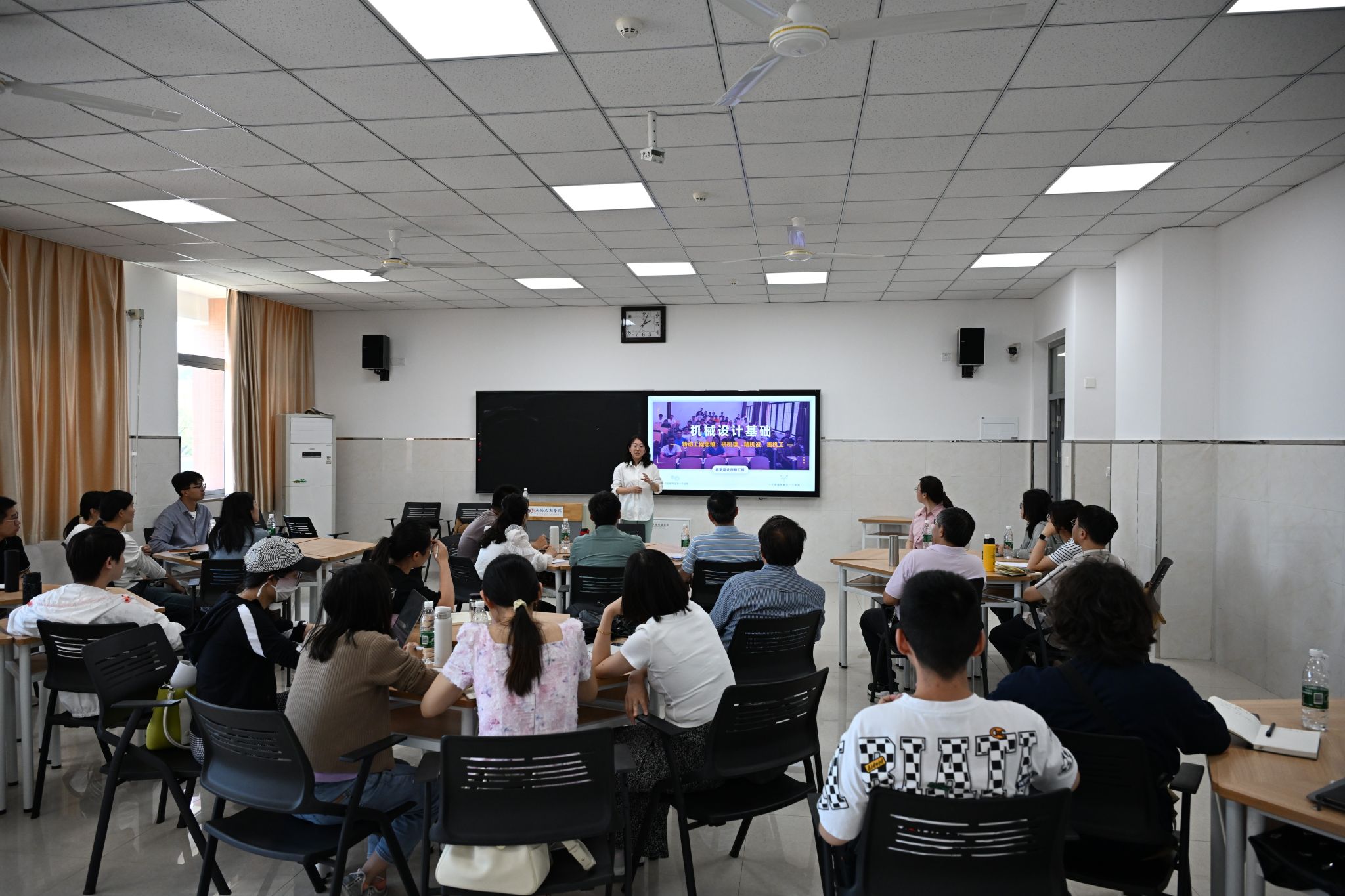 活动于5月29日在商科楼A201举行,我院教学副院长杨敏、常务副院长任乃飞出席活动,学院全体教师来到现场聆听祖教授的示范课。活动开始,杨院对本次示范课的开展做了简短的讲话,希望通过本次活动能鼓励更多的老师参加各级各类教学比赛,推动教学改革和教学创新。祖教授先是进行了15分钟的说课,说课内容为教学创新大赛参赛作品。后开展了一堂45分钟的正式授课,示范课课程为机械设计基础。祖教授的课程特点是以项目为导向,让学生对课堂动心、自觉动脑思考、自发动手操作,通过这“三动”完成了知识从理论到实践的过程。